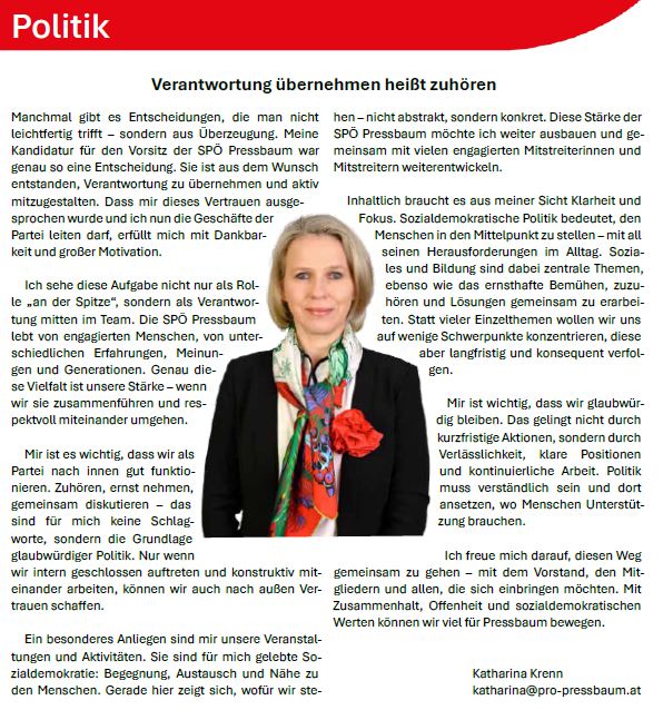 Verantwortung übernehmen heißt zuhören: In dieser Ausgabe stellt sich Katharina Krenn als neue Obfrau der SPÖ Pro Pressbaum vor.